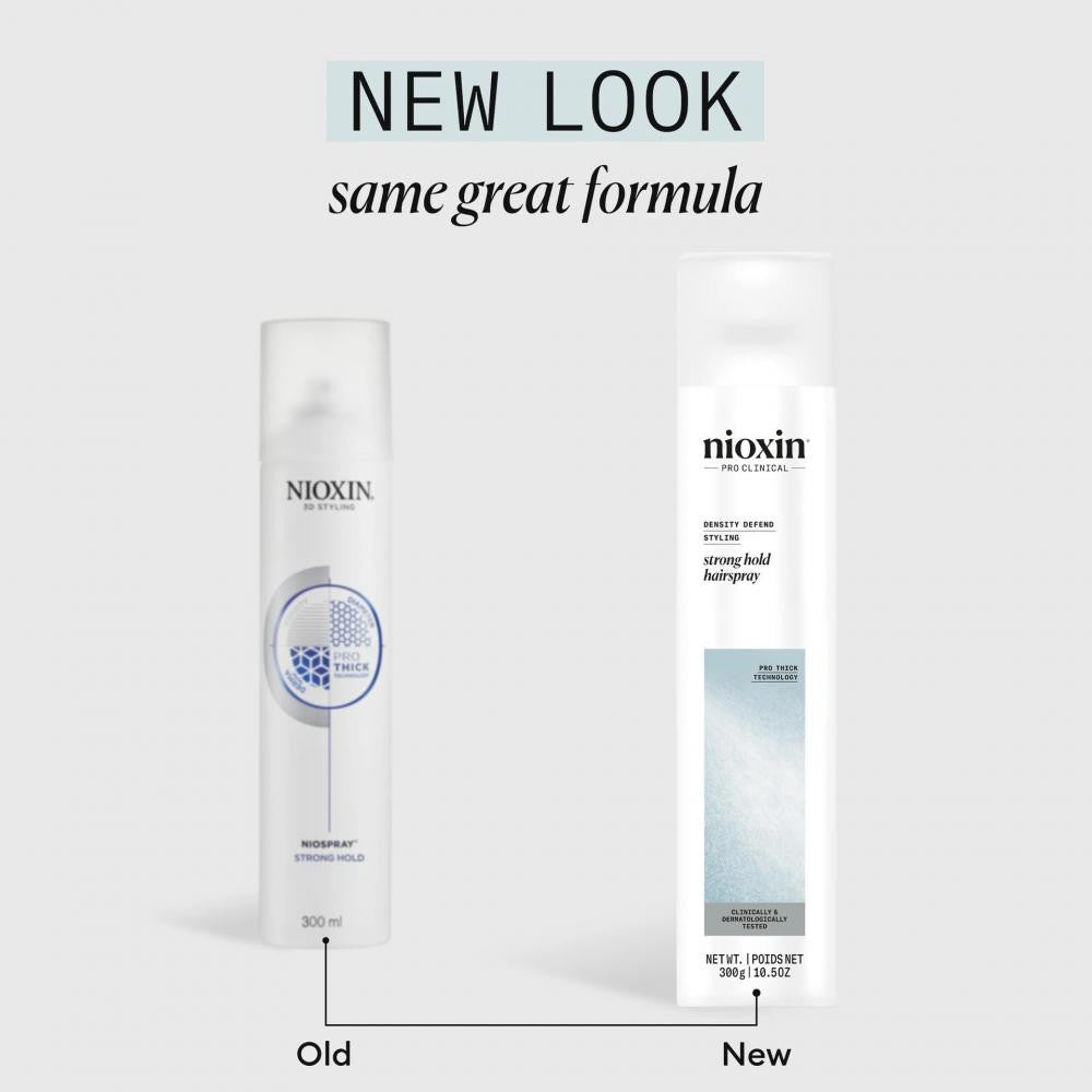 Nioxin's Niospray Extra Firm Hold provides a firm hold, as well as texture and a fuller appearance to fine hair. Its lightweight formula is easy to work with. FEATURES: Firm, long-lasting hold. Easy to brush. Makes hair appear fuller. Adds movement. Provides flexibility. Makes hair shiny. Resists humidity. DIRECTIONS: Use on dry hair. Style as desired from approximately 10-15 cm away. Spray to set your style.